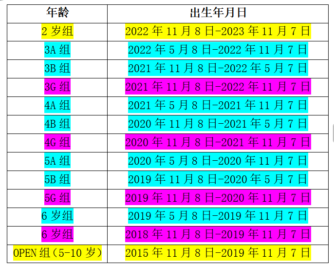 2,赛事组别:2岁组、3A组、3B组、3G组、4A组、4B组、4G组、5A组、5B组、5GA组、6岁组、OPEN组(5-10岁)共12个参赛组别。